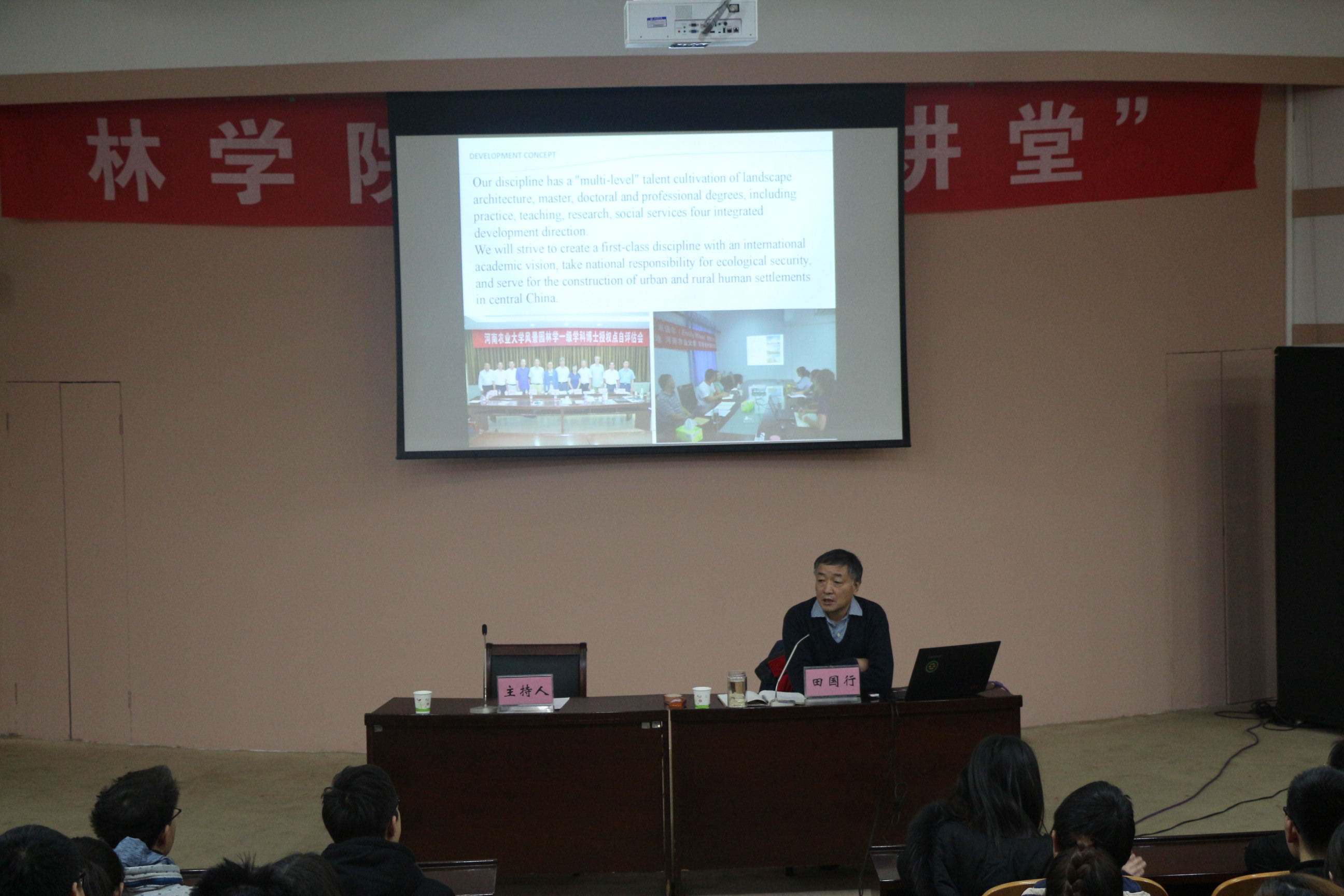报告会上,围绕“风景园林的国际化视野”这一主题,田国行教授就风景园林专业发展的国内外成果做了详细介绍,结合实例浅析了“汇聚世界智慧,解决生态难题”的概念,提出加强与国际风景园林专家的交流合作,把世界的建设经验与我国地区文化相结合,推进“顺应自然,尊重自然,人与自然和谐相处”的设计理念。针对风景园林专业的学习,田教授强调要掌握科学的学习研究方法,在实践中理解并掌握理论知识。他表示我国的一带一路建设促进了我国与世界的学术交流,青年学子要抓住契机,拓展自身国际视野,构建风景园林理论知识体系。田教授理论扎实,语言诙谐幽默,给大家带来了一场精彩的学术报告,为学生今后的专业学习与研究提供了新思路。