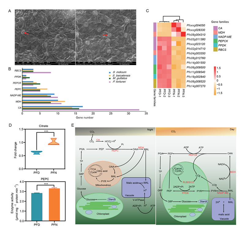 研究发现,泡桐为C3植物,光合速率高,叶片气孔晚上开放,且具有的CAM途径关键基因拷贝数大于唇形目其它C3植物。基于有机酸含量、酶活及其相关基因表达量分析发现,泡桐有CAM光合特性。C3-CAM光合作用特征是泡桐速生的关键因素(图 2)。
