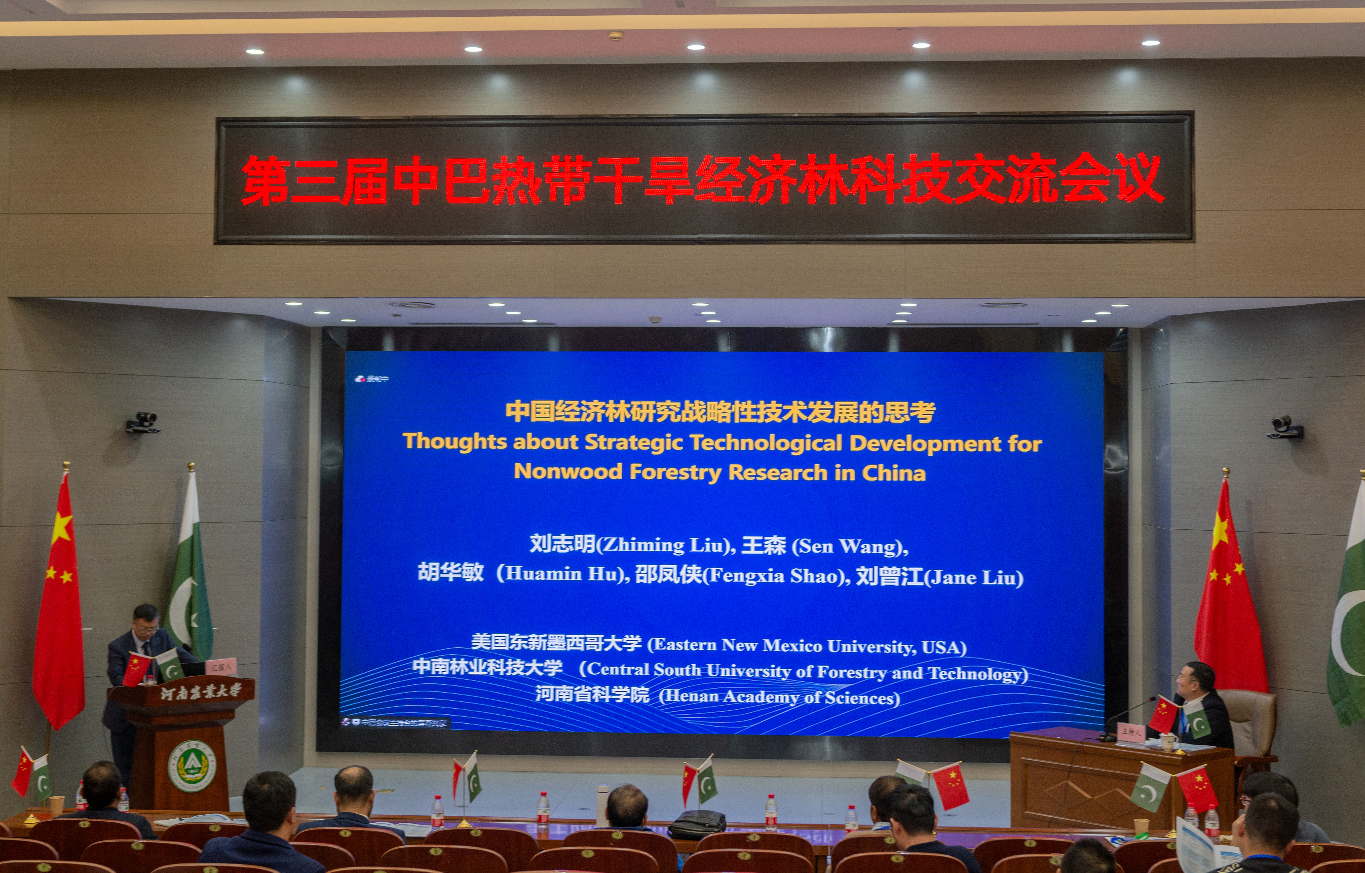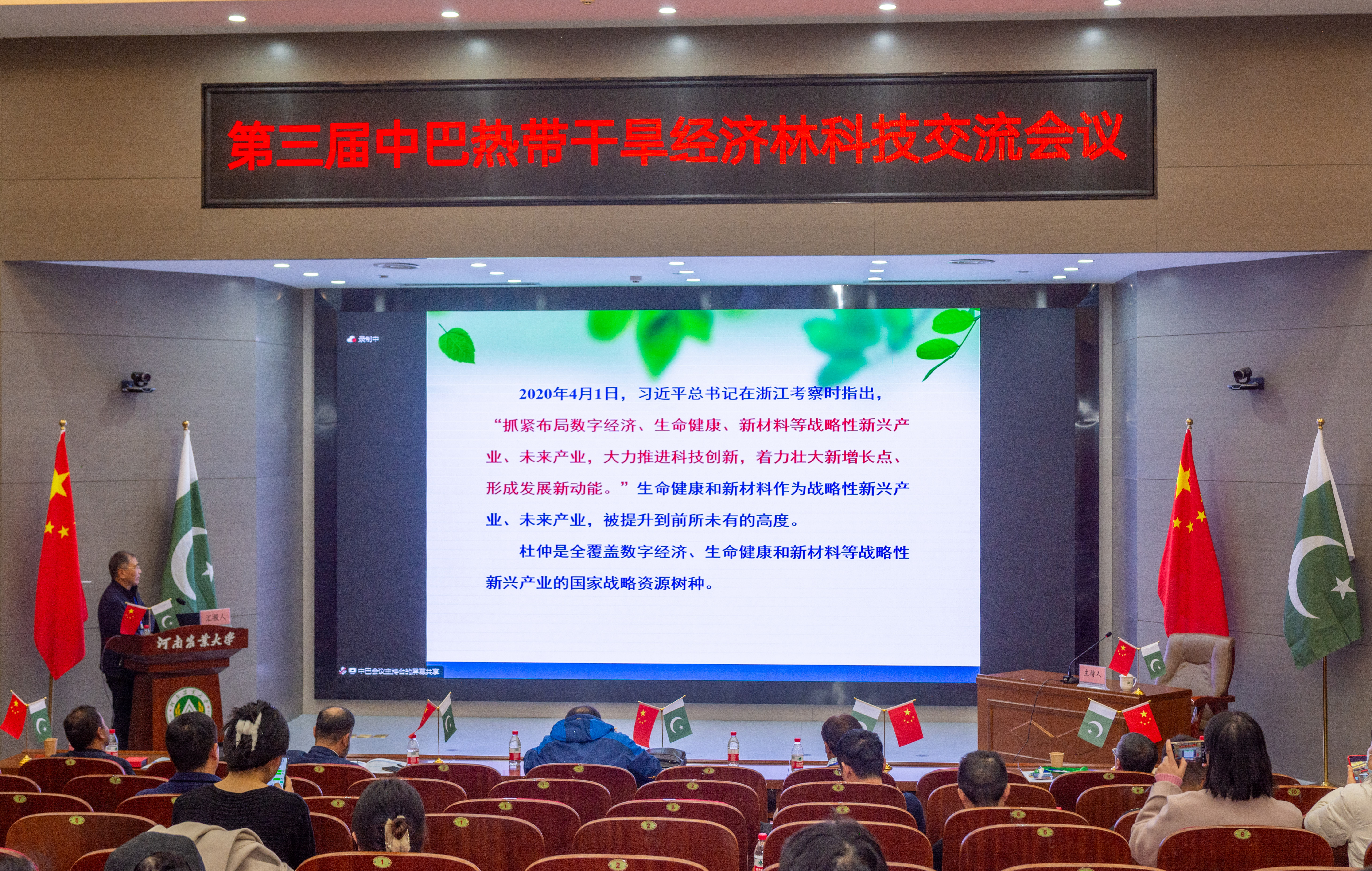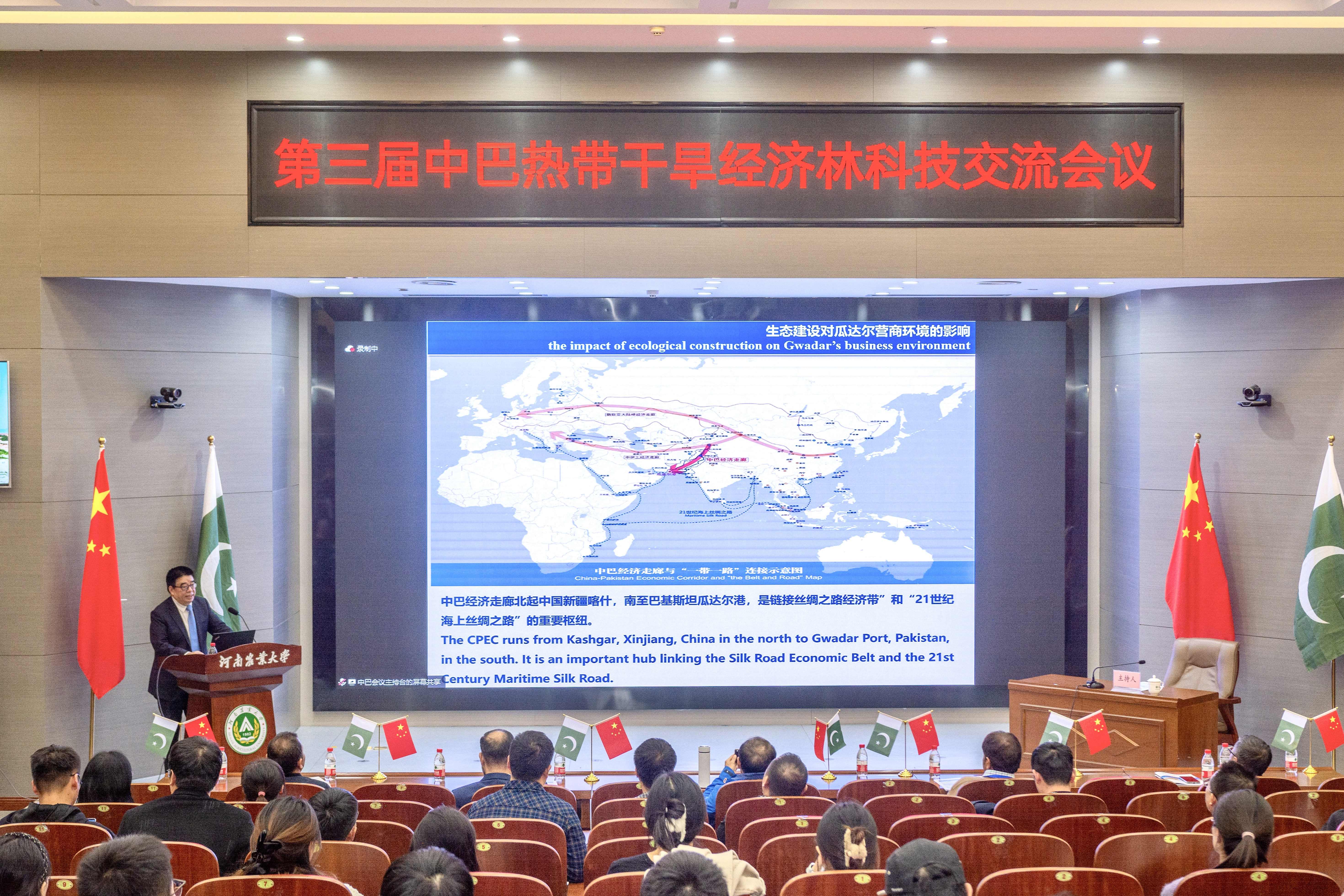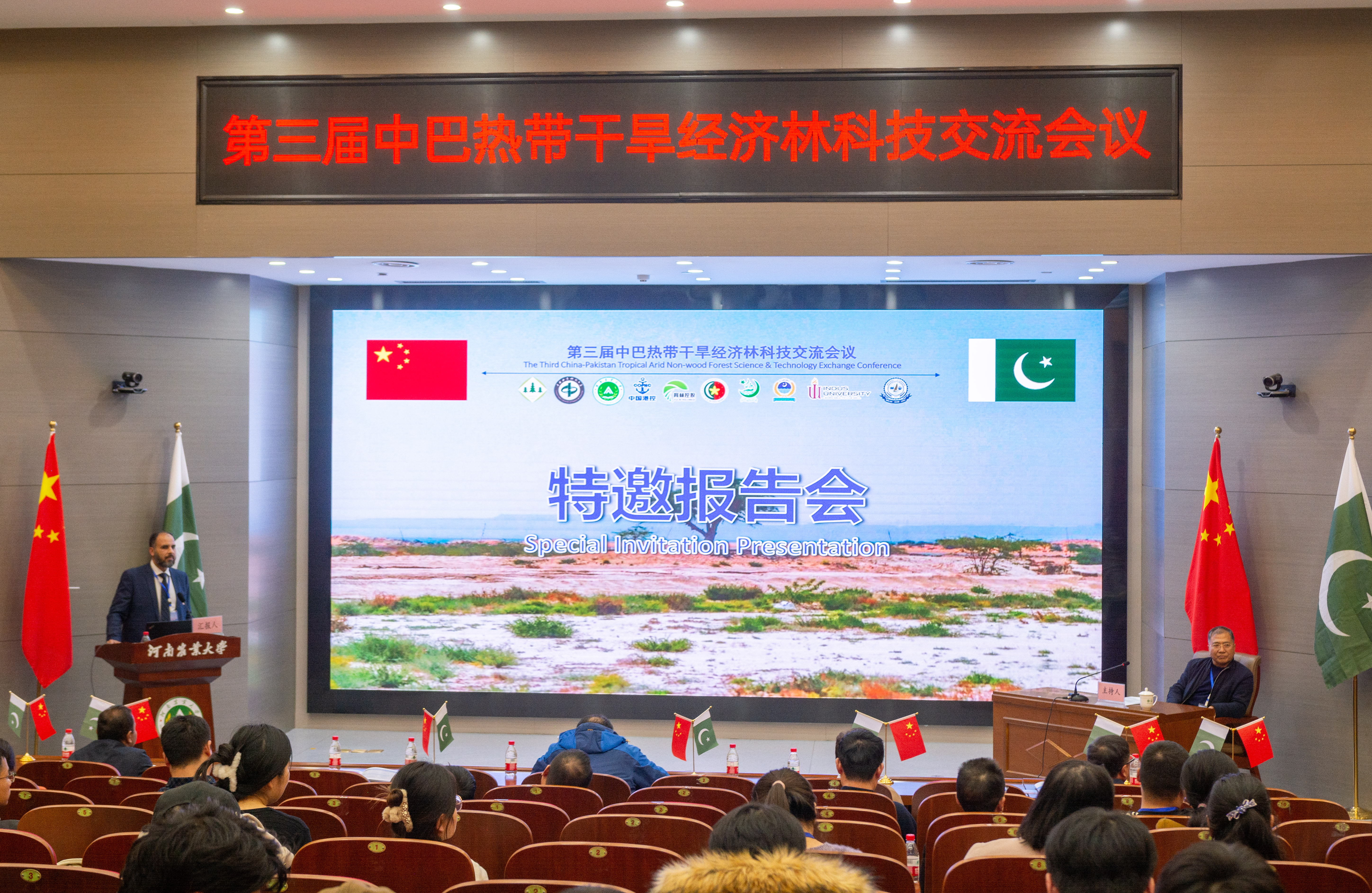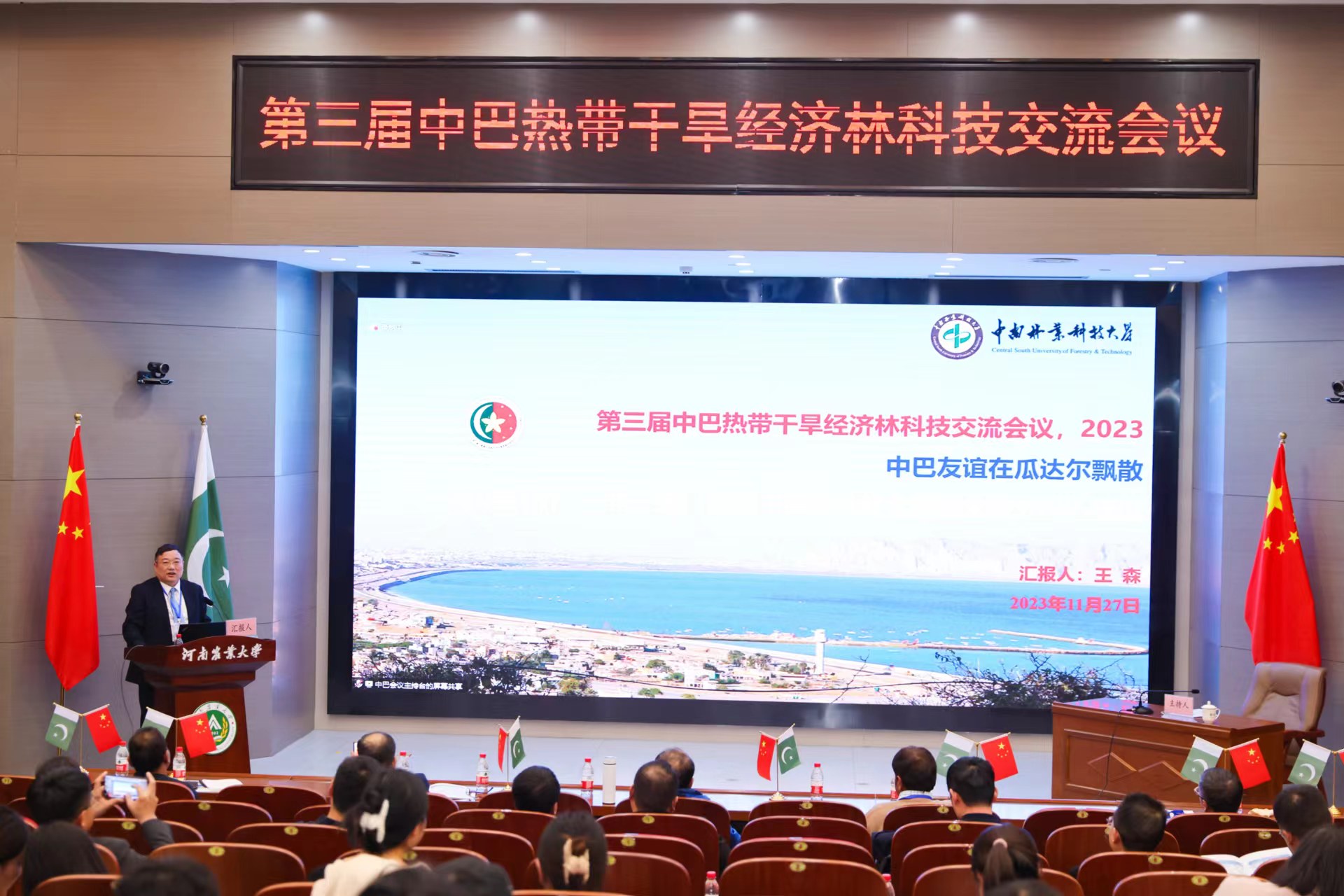 2023年11月27日上午,由中国林学会、中南林业科技大学主办,丝袜av 、河南省林学会、中国林学会经济林分会、中国海外港口控股有限公司、育林控股有限公司、卡拉奇大学、费萨拉巴德农业大学、印度河大学、瓜达尔大学、“一带一路”干旱经济林国家创新联盟、湖南省“一带一路”热带干旱经济林国际联合研究中心承办的第三届中巴热带干旱经济林科技交流会议,以线上线下结合的方式在我校和巴基斯坦瓜达尔自由区同时开幕。本次会议以“木本药材与活性物质”为主题。来自我校和中国林学会、中南林业科技大学、中国林科院经济林中心和亚林中心、巴基斯坦印度河大学、卡拉奇大学、瓜达尔大学、费萨拉巴德农业大学等单位的领导嘉宾、专家学者和企业家等200余人参加会议。校长介晓磊出席会议并致辞。丝袜av 院长范国强主持会议。