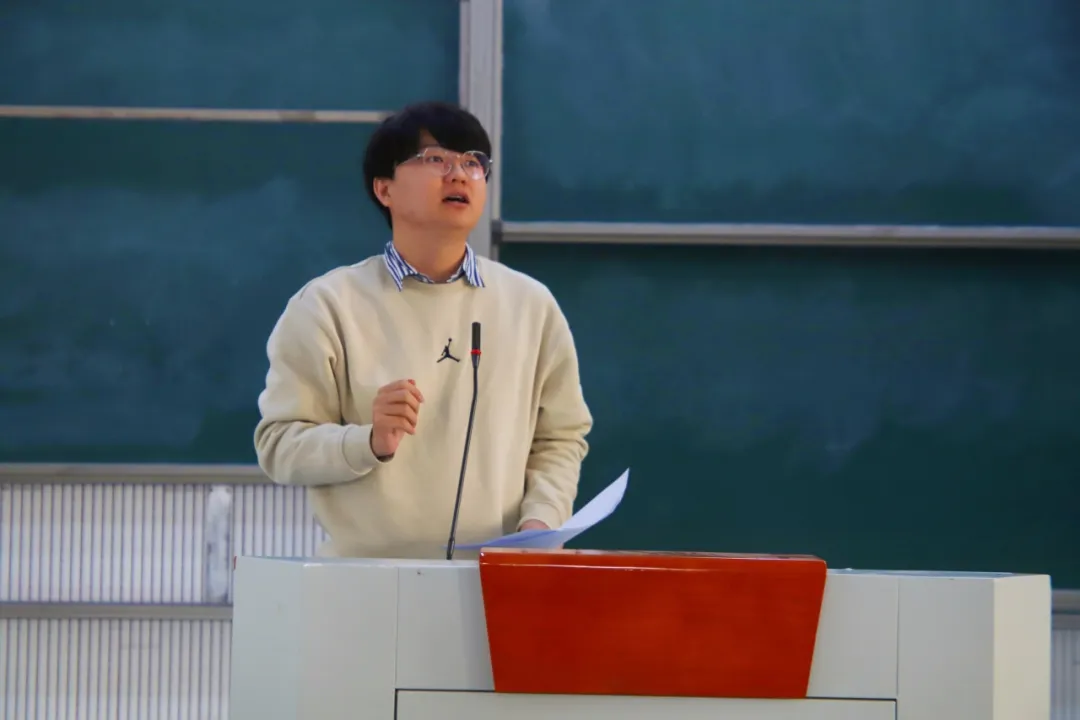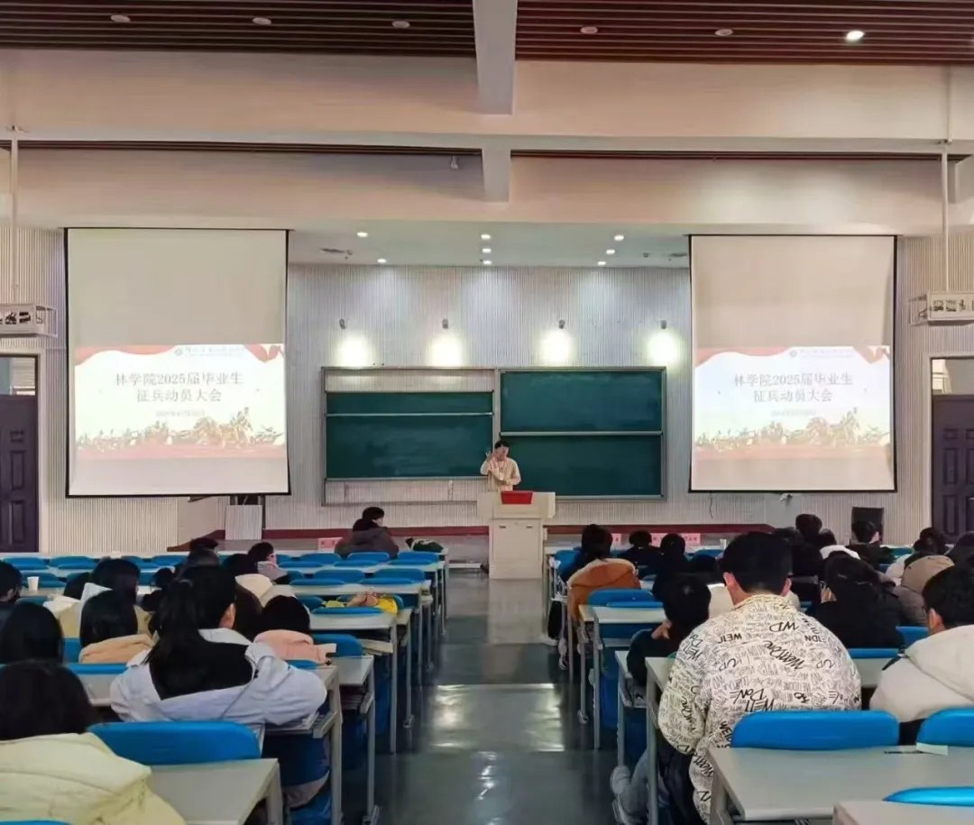 于于龙子湖校区繁塔楼大教室-2开展2025届毕业生征兵动员大会暨资助政策“两节课”宣讲会。院团委老师马蒙恩担任主讲人,2025届全体毕业生参加本次会议。