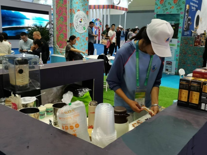 来自丝袜av 外国语学院的金鑫鑫主要负责郑州会展中心相关展区的产品介绍,如马来西亚的咖啡,有槟州城白咖啡、黑咖啡、卡布奇诺、拿铁、摩卡等,她将这些产品的名字熟记于心,并向顾客介绍咖啡的出售方式、价格等。