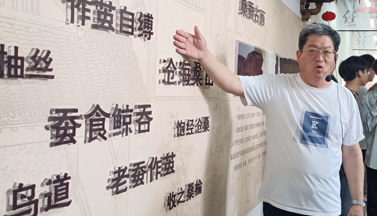 参观伊始,讲解员绘声绘色地为同学们讲解了从古至今千年蚕桑历史文化,同学们倾耳注目、聚精会神地听着讲解员说的一字一句。