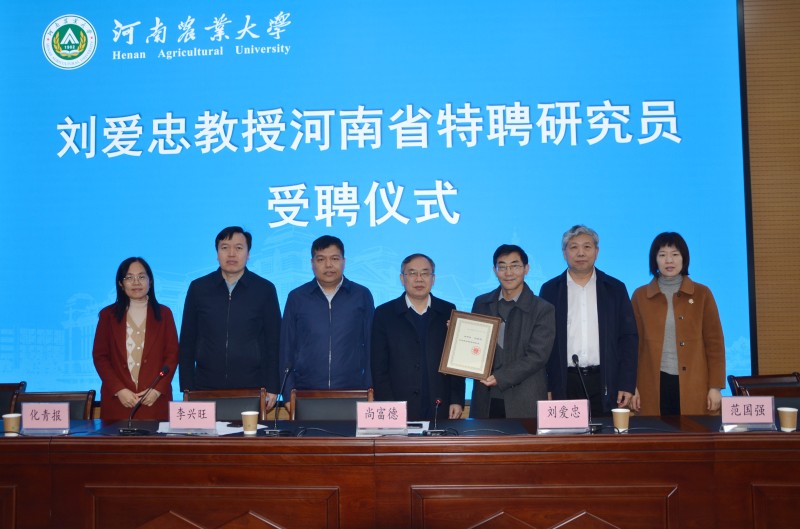 报告厅举行河南省特聘研究员聘任仪式,刘爱忠教授受聘为我校河南省特聘研究员。副校长尚富德出席聘任仪式,并为刘爱忠教授颁发聘书。人事处负责人李兴旺、丝袜av