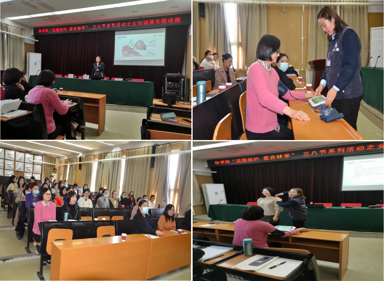 首先,张学芳向在座的各位女教工送去了节日的问候以及亲切的关怀。接着,王琳琳结合实际案例,针对教师群体熬夜、久坐不站等职业特点与大家分享如何做好日常保健与疾病预防。她向老师们详细讲解了宫颈癌和乳腺癌的预防、紧急救护方法、脑梗和心梗的预防以及职业性骨骼疾病预防和治疗等知识。她富有幽默感的语言赢得在座老师的一致好评。教学过程中,王琳琳邀请多位老师进行互动,采用体验式学习方法向老师们认真展示了海姆立克急救法的正确手法、缺血预适应的原理及操作方法等,老师们积极配合,收获颇丰。