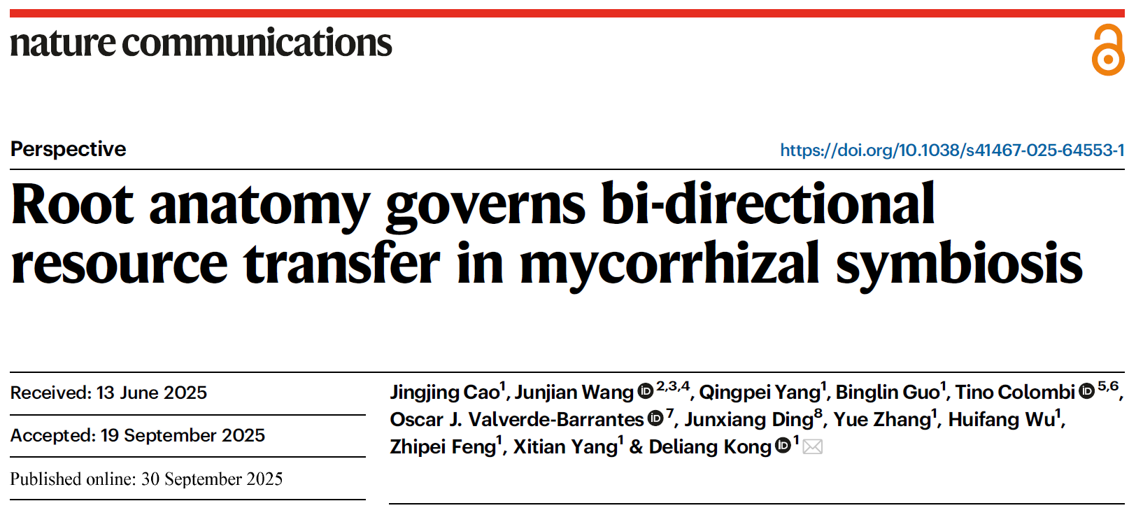 本网讯(通讯员 曹静静)2025年9月30日,丝袜av 孔德良教授团队在国际顶级期刊《Nature Communications》上发表题为《Root anatomy governs bi-directional resource transfer in mycorrhizal symbiosis》的观点论文。本研究首次提出了“碳-养分双向转运理论”,整合了根系解剖结构、能量成本,以及菌根真菌发生部位这些重要的生物物理特征,为我们认识根与菌根真菌之间的协同进化和环境适应性提供了新的研究思路。